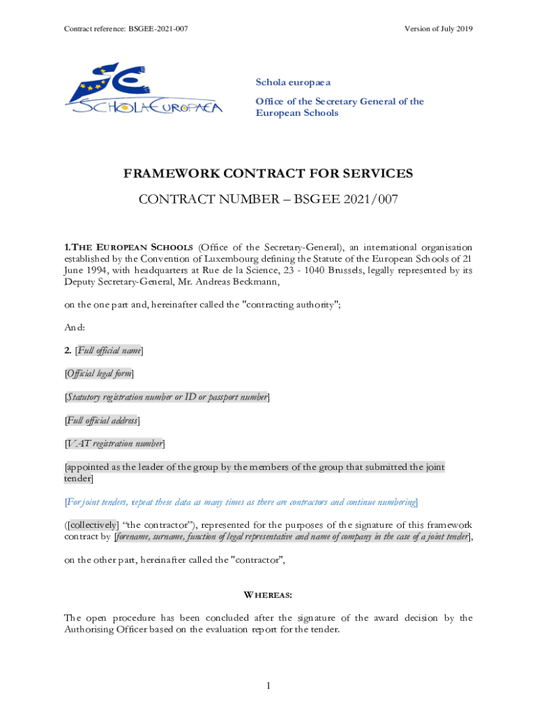 Contract reference: BSGEE2021007Version of July 2019Schola European Office of the Secretary General of the European SchoolsFRAMEWORK CONTRACT FOR SERVICES CONTRACT NUMBER BSG EE 2021/0071.THE EUROPEAN