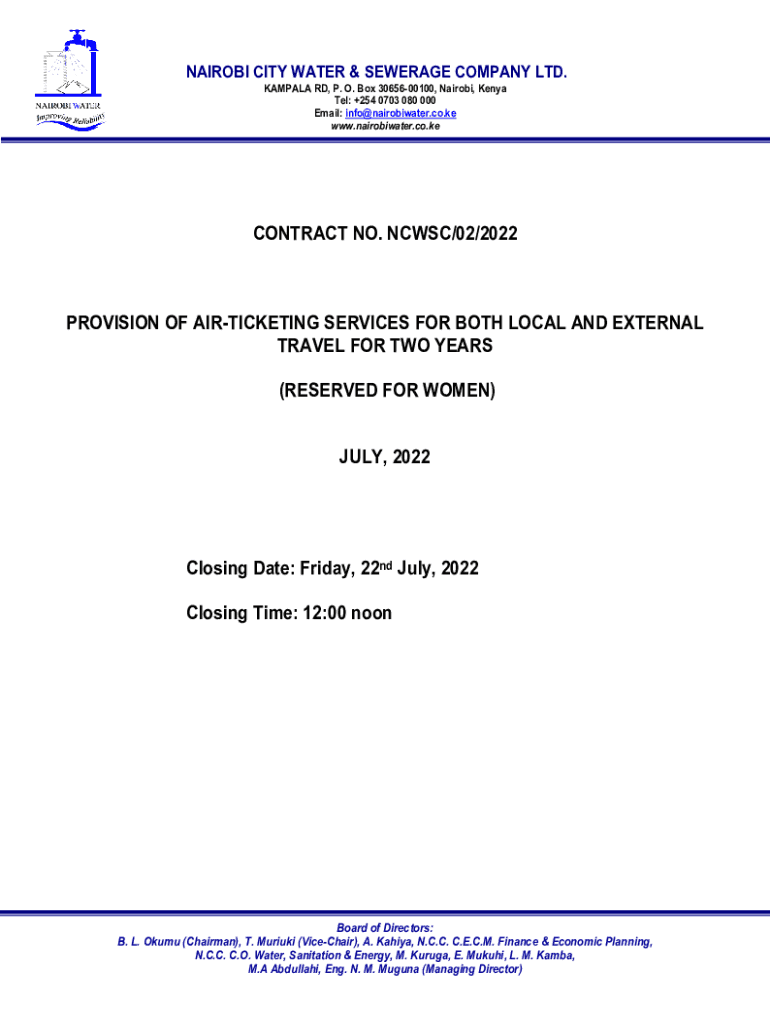 NAIROBI CITY WATER & SEWERAGE COMPANY LTD. KAMPALA RD, P. O. Box 3065600100, Nairobi, Kenya Tel: +254 0703 080 000 Email: info@nairobiwater.co.ke www.nairobiwater.co.keCONTRACT NO. NC WSC/02/2022PROVISION