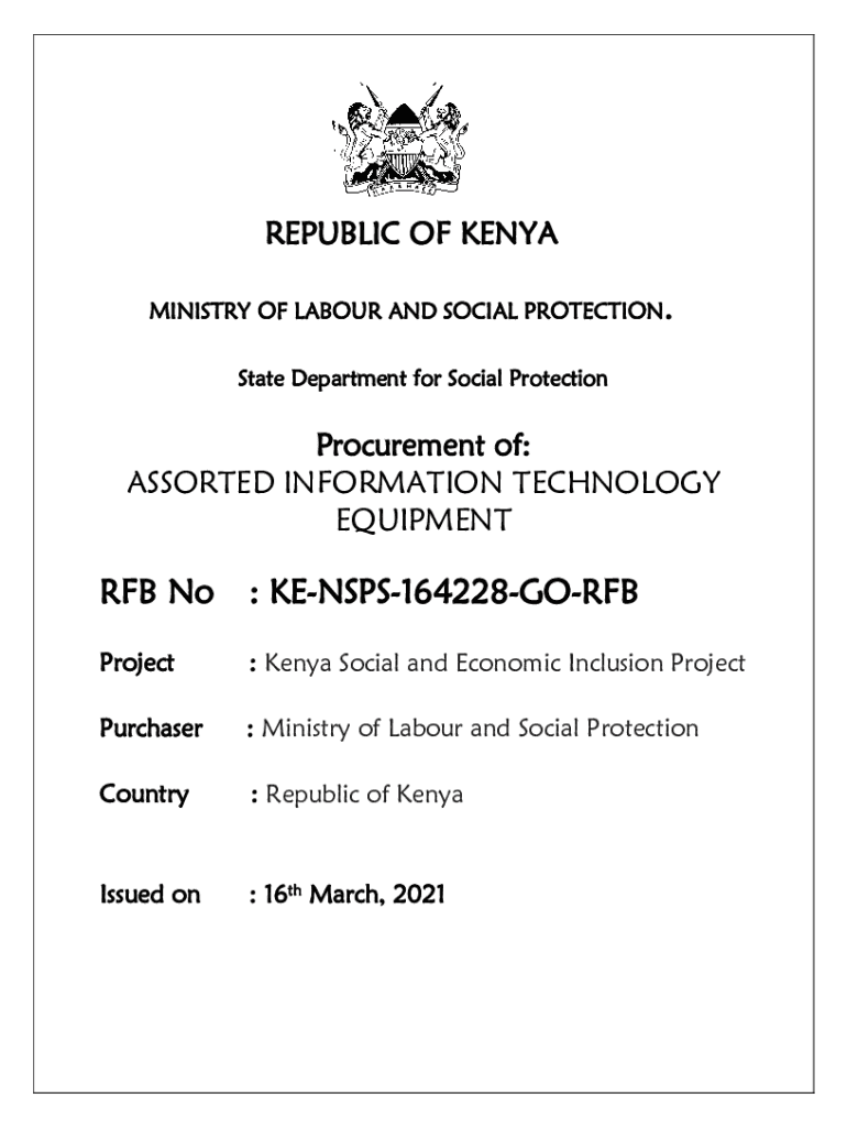 REPUBLIC OF KENYA MINISTRY OF Labor AND SOCIAL PROTECTION. State Department for Social ProtectionProcurement of: ASSORTED INFORMATION TECHNOLOGY EQUIPMENT No: KENSPS164228GORFBProject: Kenya Social