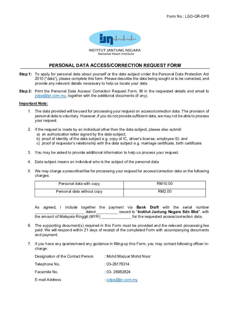 Form No.: LGDQRDP8PERSONAL DATA ACCESS/CORRECTION REQUEST FORM Step 1: To apply for personal data about yourself or the data subject under the Personal Data Protection Act 2010 (data), please complete
