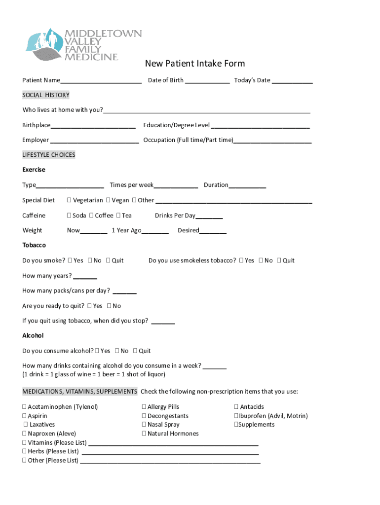New Patient Intake Form Patient Name Date of Birthdays Date ___SOCIAL HISTORY Who lives at home with you? ___ Birthplace___Education/Degree Level ___Employer ___ Occupation (Full time/Part time)___