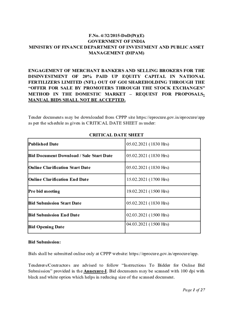 F. No. 4/32/2015DoD(Pt)(E) GOVERNMENT OF INDIA MINISTRY OF FINANCE DEPARTMENT OF INVESTMENT AND PUBLIC ASSET MANAGEMENT (IPAM)ENGAGEMENT OF MERCHANT BANKERS AND SELLING BROKERS FOR THE DISINVESTMENT
