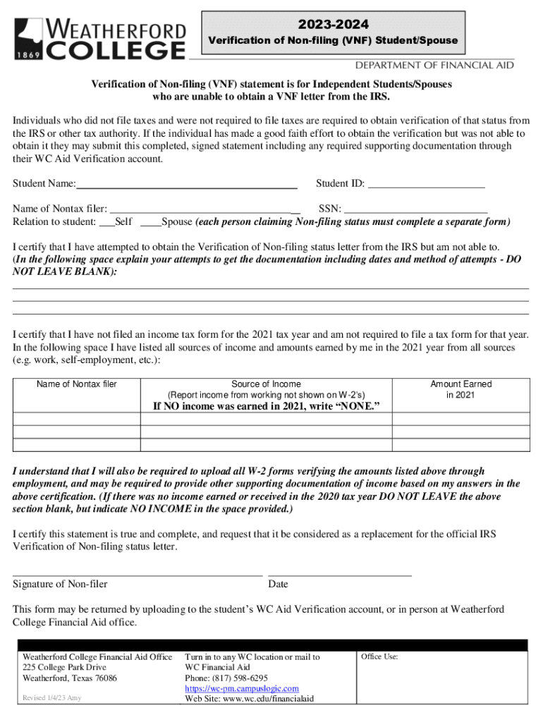 20232024 Verification of Nonfiling (SNF) Student/SpouseVerification of Nonfiling (SNF) statement is for Independent Students/Spouses who are unable to obtain an SNF letter from the IRS. Individuals