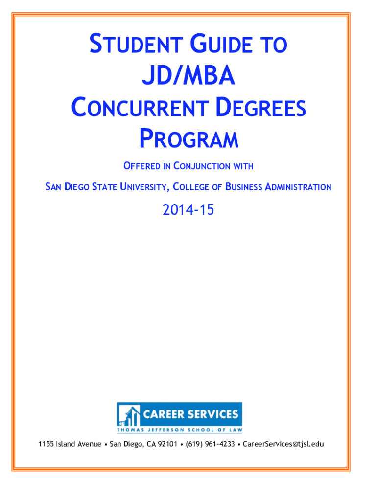 STUDENT GUIDE TO JD/MBA CONCURRENT DEGREES PROGRAM OFFERED IN CONJUNCTION WITH SAN DIEGO STATE UNIVERSITY, COLLEGE OF BUSINESS ADMINISTRATION2014151155 Island Avenue San Diego, CA 92101 (619) 9614233