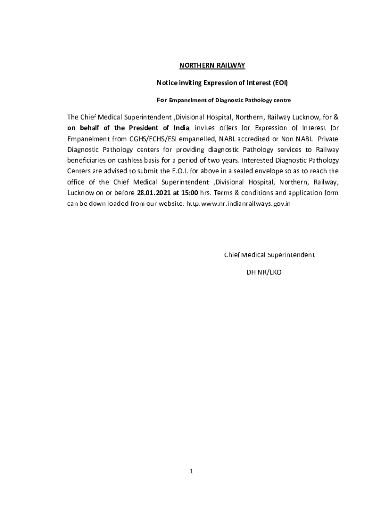 NORTHERN RAILWAY Notice inviting Expression of Interest (EOI) For Embankment of Diagnostic Pathology center The Chief Medical Superintendent, Divisional Hospital, Northern, Railway Lucknow, for &