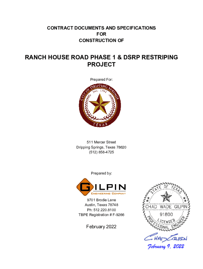CONTRACT DOCUMENTS AND SPECIFICATIONS FOR CONSTRUCTION FRENCH HOUSE ROAD PHASE 1 & DSP RESTRICTING PROJECT Prepared For:511 Mercer Street Dripping Springs, Texas 78620 (512) 8584725Prepared by:9701