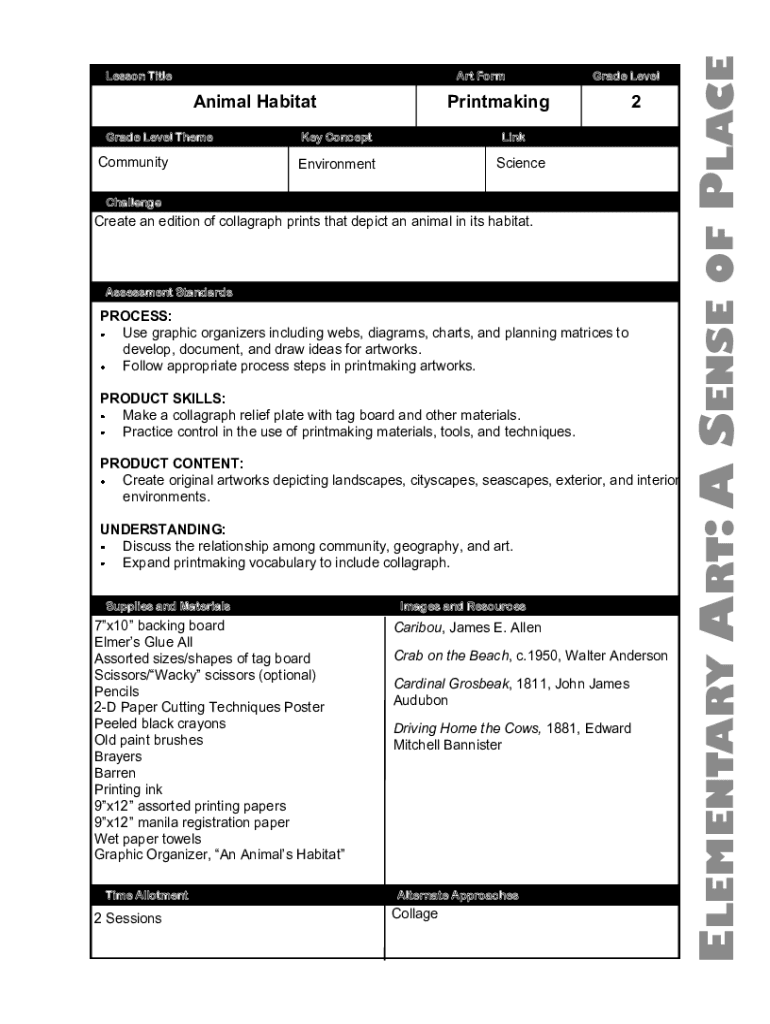 Grade Level ThemeCommunityGrade LevelPrintmakingKey Concept2LinkScienceEnvironmentChallengeCreate an edition of calligraphy prints that depict an animal in its habitat. Assessment