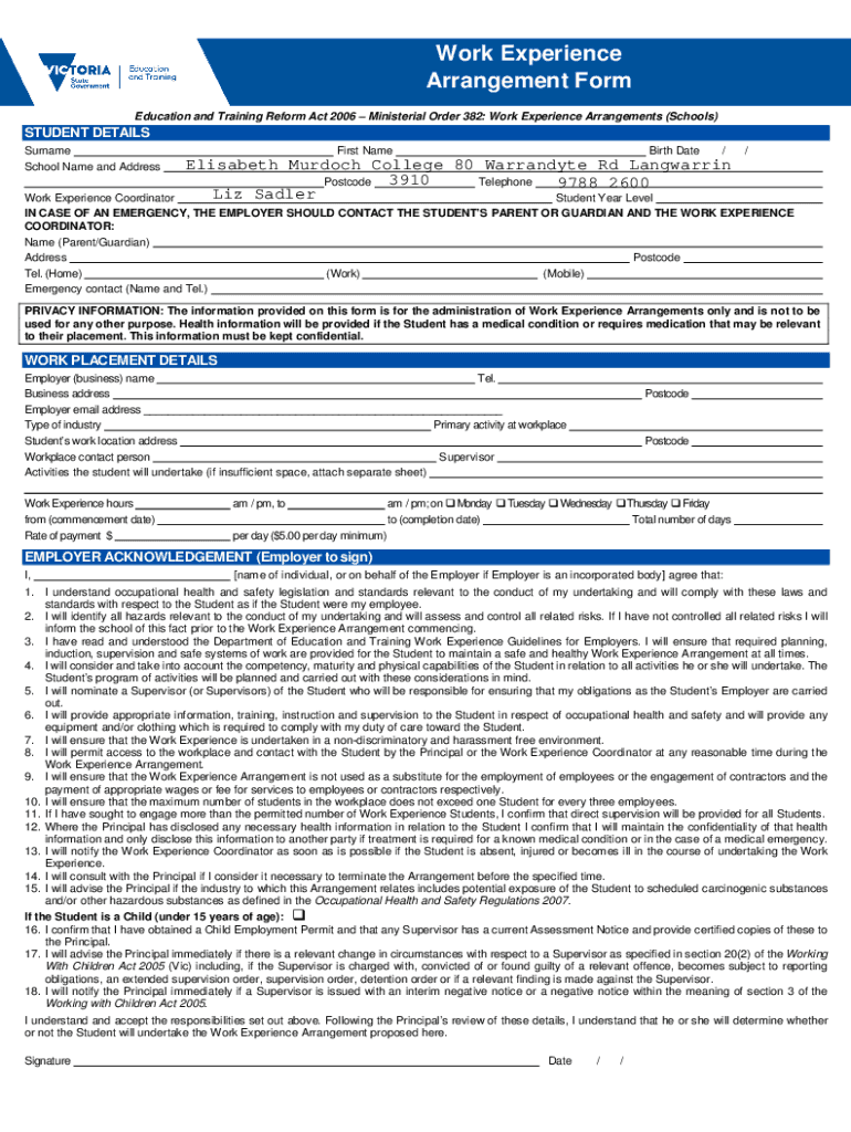 Work Experience Arrangement Form Education and Training Reform Act 2006 Ministerial Order 382: Work Experience Arrangements (Schools)STUDENT DETAILS Surname School Name and AddressFirst Rebirth Date//Elisabeth
