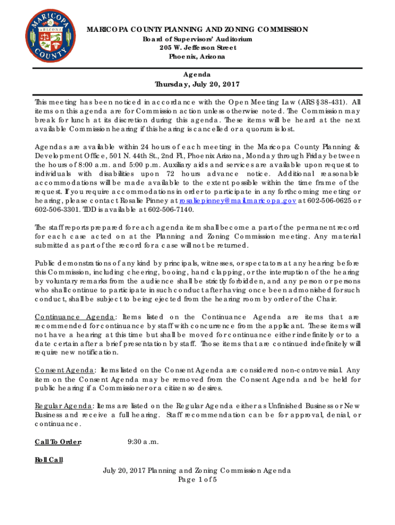MARICOPA COUNTY PLANNING AND ZONING COMMISSION Board of Supervisors Auditorium 205 W. Jefferson Street Phoenix, Arizona Agenda Thursday, July 20, 2017, This meeting has been noticed in accordance