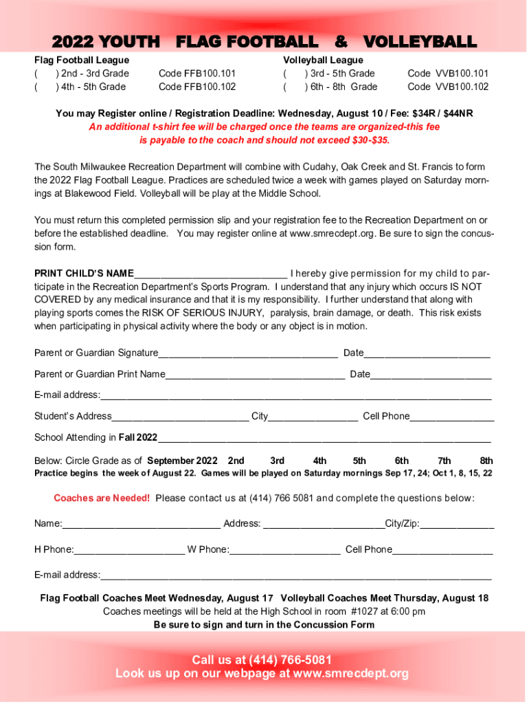 2022 YOUTH FLAG FOOTBALL League () 2nd 3rd Grade () 4th 5th Graded FFB100.101 Code FFB100.102&VOLLEYBALLVolleyball League () 3rd 5th Grade () 6th 8th Graded VVB100.101 Code VVB100.102You may Register