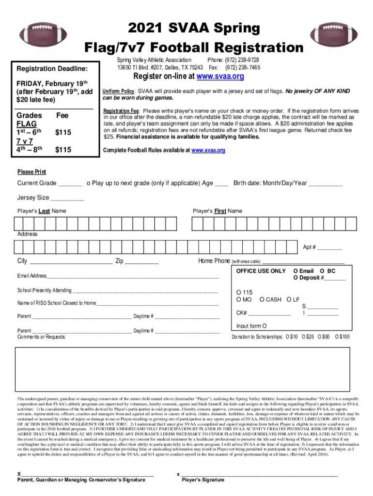 2021 SAA Spring Flag/7v7 Football Registration Deadline: FRIDAY, February 19th (after February 19th, add $20 late fee)Grades FLAG 1st 6th 7v7 4th 8thFee $$115115Spring Valley Athletic Association