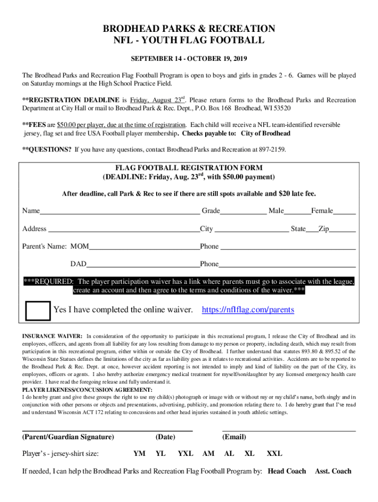 GODHEAD PARKS & RECREATION NFL YOUTH FLAG FOOTBALL SEPTEMBER 14 OCTOBER 19, 2019, The Godhead Parks and Recreation Flag Football Program is open to boys and girls in grades 2 6. Games will be played
