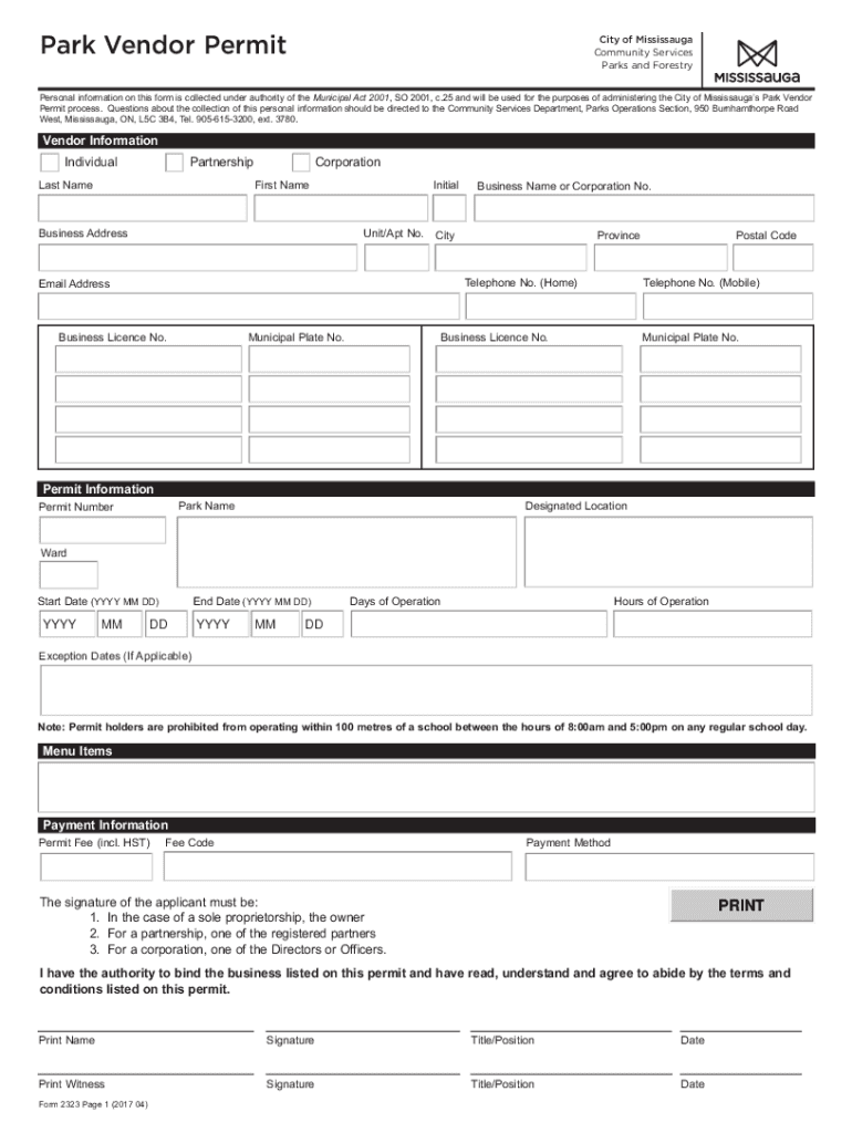 Park Vendor Permitting of Mississauga Community Services Parks and ForestryPersonal information on this form is collected under authority of the Municipal Act 2001, SO 2001, c.25 and will be used