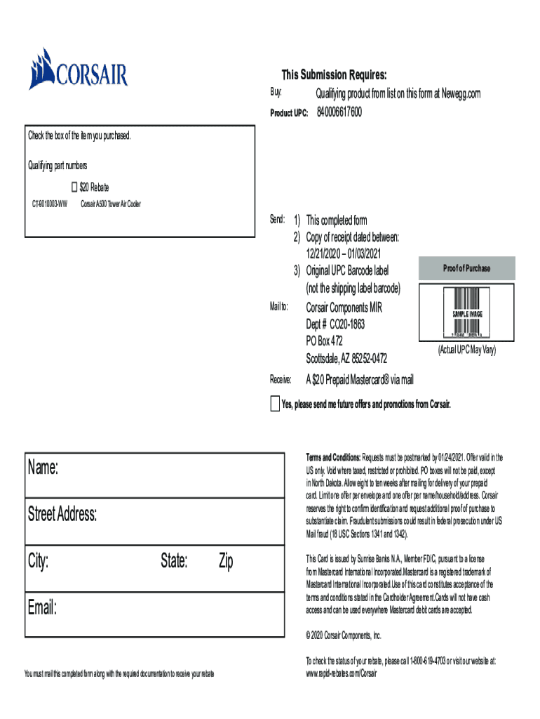 This Submission Requires: Buy: Qualifying product from list on this form at Newegg.com Product UPC:840006617600 Check the box of the item you purchased. Qualifying part numbers $20 Rebate CT9010003WWCorsair