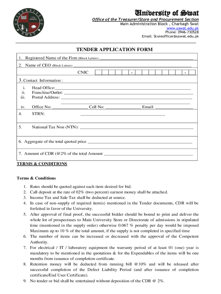 University of Swat Office of the Treasurer/Store and Procurement Section Main Administration Block, Chargaff Swat www.uswat.edu.pk Phone: 0946730528 Email: Storeofficer@uswat.edu.pkTENDER APPLICATION