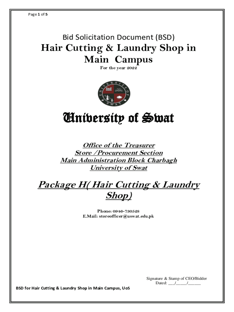 Page 1 of 5Bid Solicitation Document (BSD)Hair Cutting & Laundry Shop in Main Campus For the year 2022University of Swat Office of the Treasurer Store /Procurement Section Main Administration Block