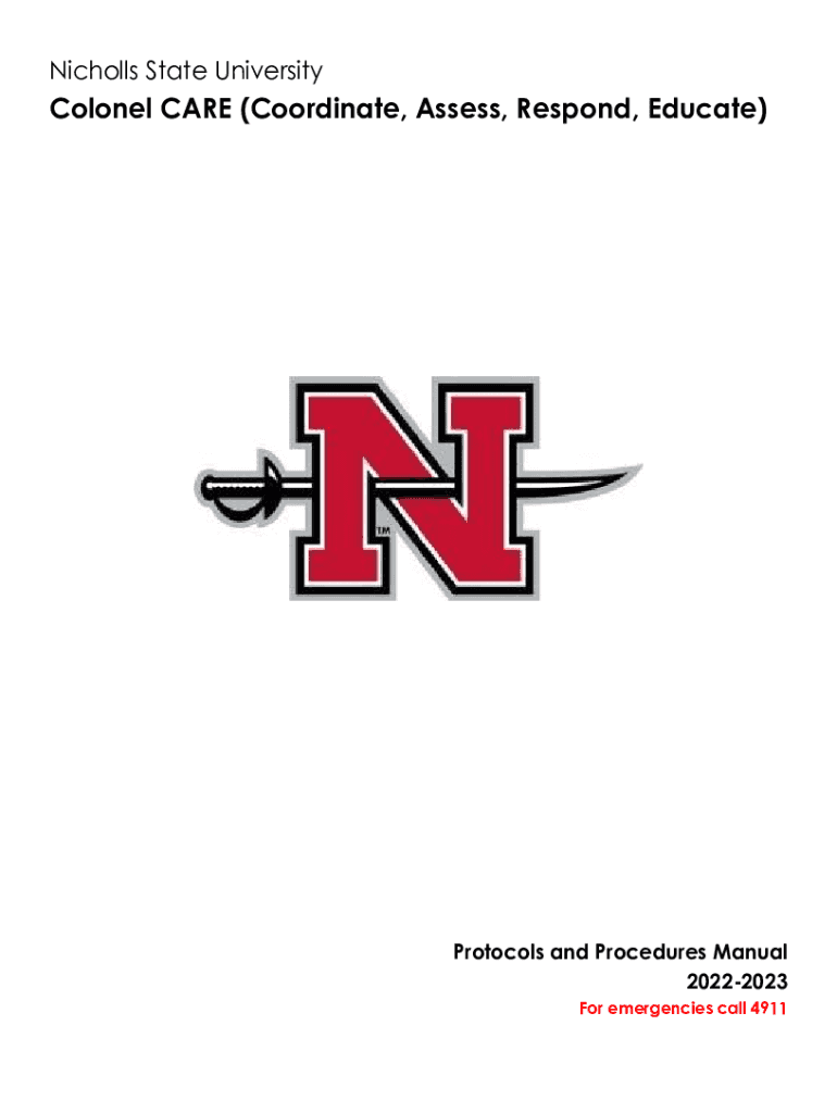 Nicholls State UniversityColonel CARE (Coordinate, Assess, Respond, Educate)Protocols and Procedures Manual 20222023 For emergencies call 4911Nicholls State UniversityColonel Care (Coordinate, Assess,