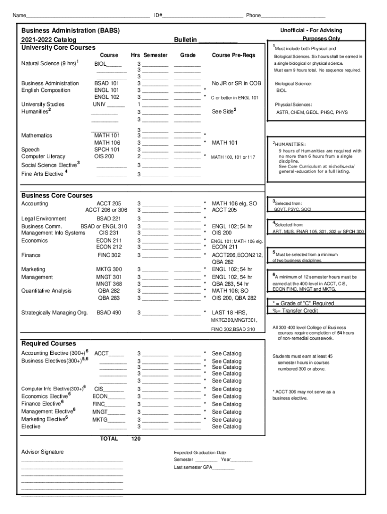 Name___ ID#___ Phone___Business Administration (BASS) 20212022 Catalog University Core Courses Course Natural Science (9 hrs)1Business Administration English Composition University Studies Humanities2Mathematics