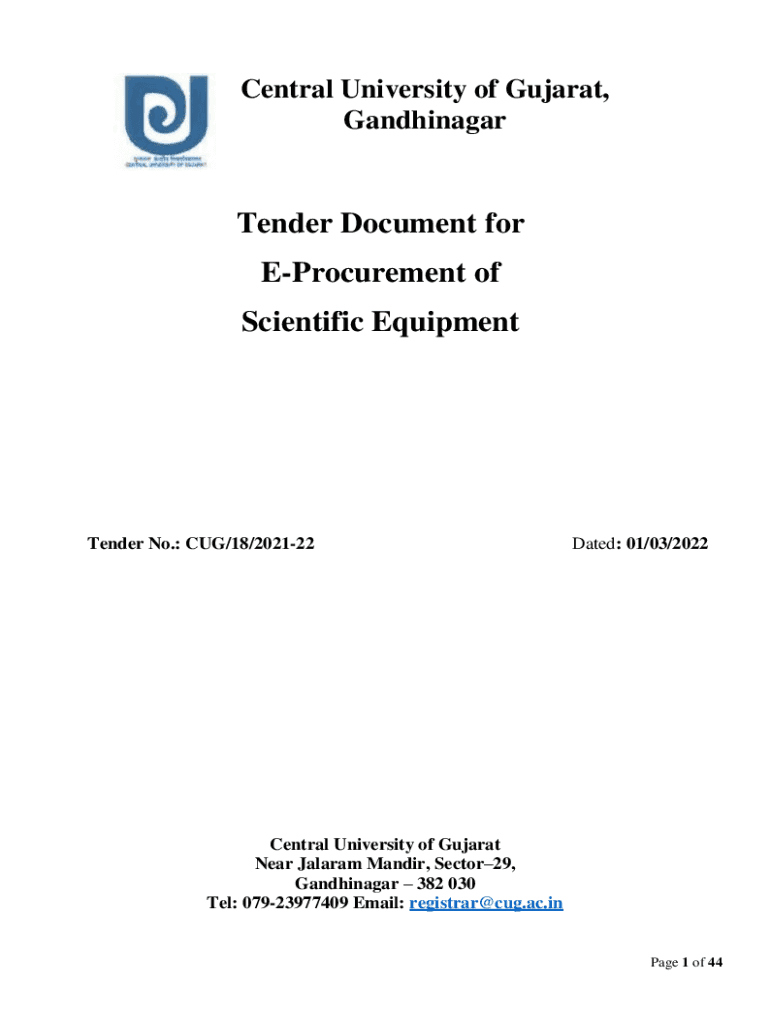 Central University of Gujarat, GandhinagarTender Document for Procurement of Scientific EquipmentTender No.: CUG/18/202122Dated: 01/03/2022Central University of Gujarat Near Alarm Manner, Sector29,