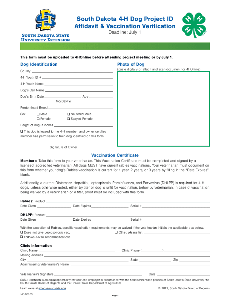 South Dakota 4H Dog Project ID Affidavit & Vaccination Verification Deadline: July 1This form must be uploaded to 4HOnline before attending project meeting or by July 1. Dog IdentificationPhoto of