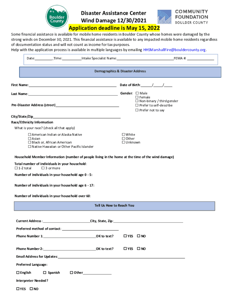Disaster Assistance Center Wind Damage 12/30/2021 Application deadline is May 15, 2022Some financial assistance is available for mobile home residents in Boulder County whose homes were damaged by