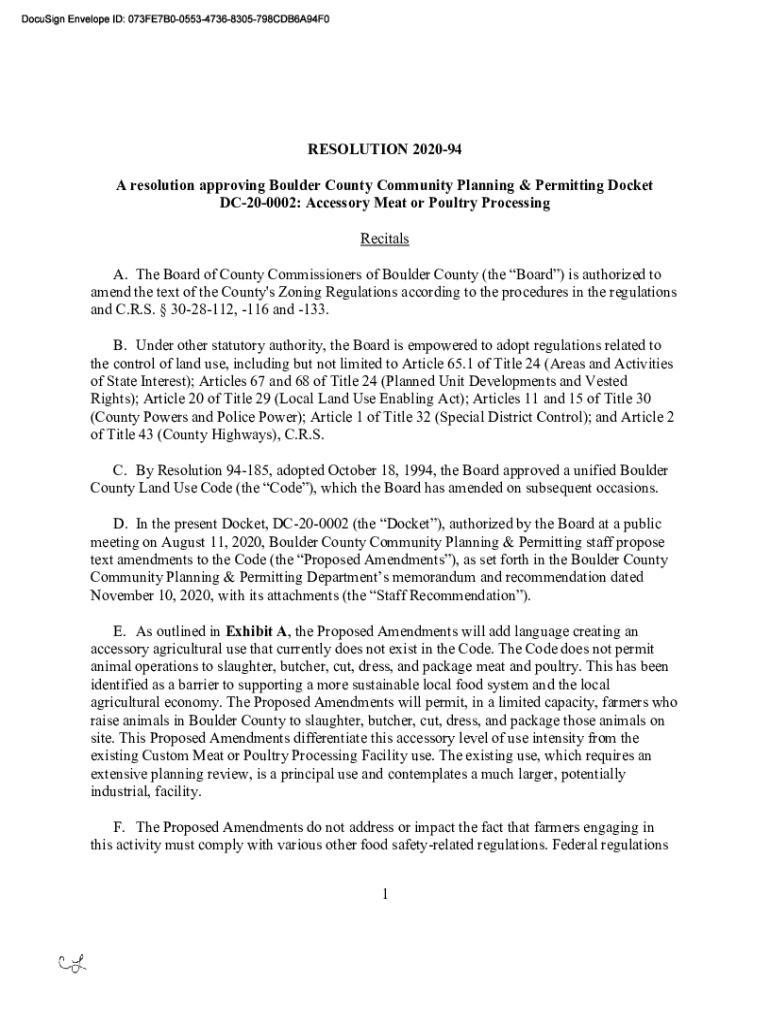 RESOLUTION 202094 A resolution approving Boulder County Community Planning & Permitting Docket DC200002: Accessory Meat or Poultry Processing Recitals A. The Board of County Commissioners of Boulder