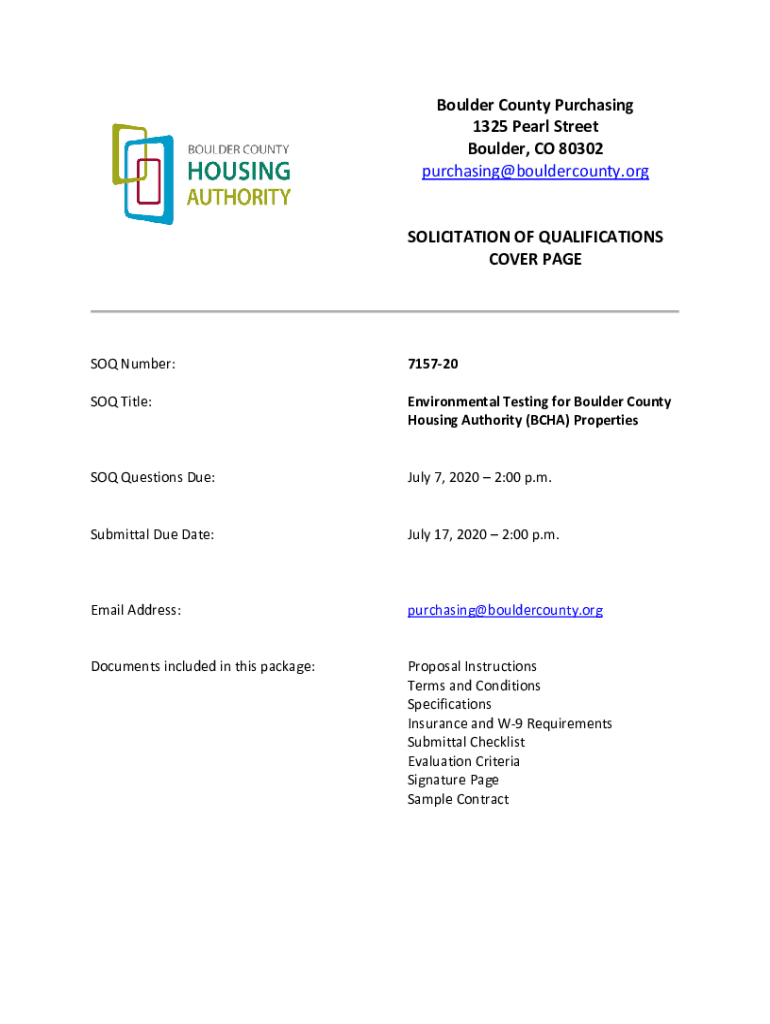 Boulder County Purchasing 1325 Pearl Street Boulder, CO 80302 purchasing@bouldercounty.org SOLICITATION OF QUALIFICATIONS COVER PAGES Number:715720SOQ Title:Environmental Testing for Boulder County