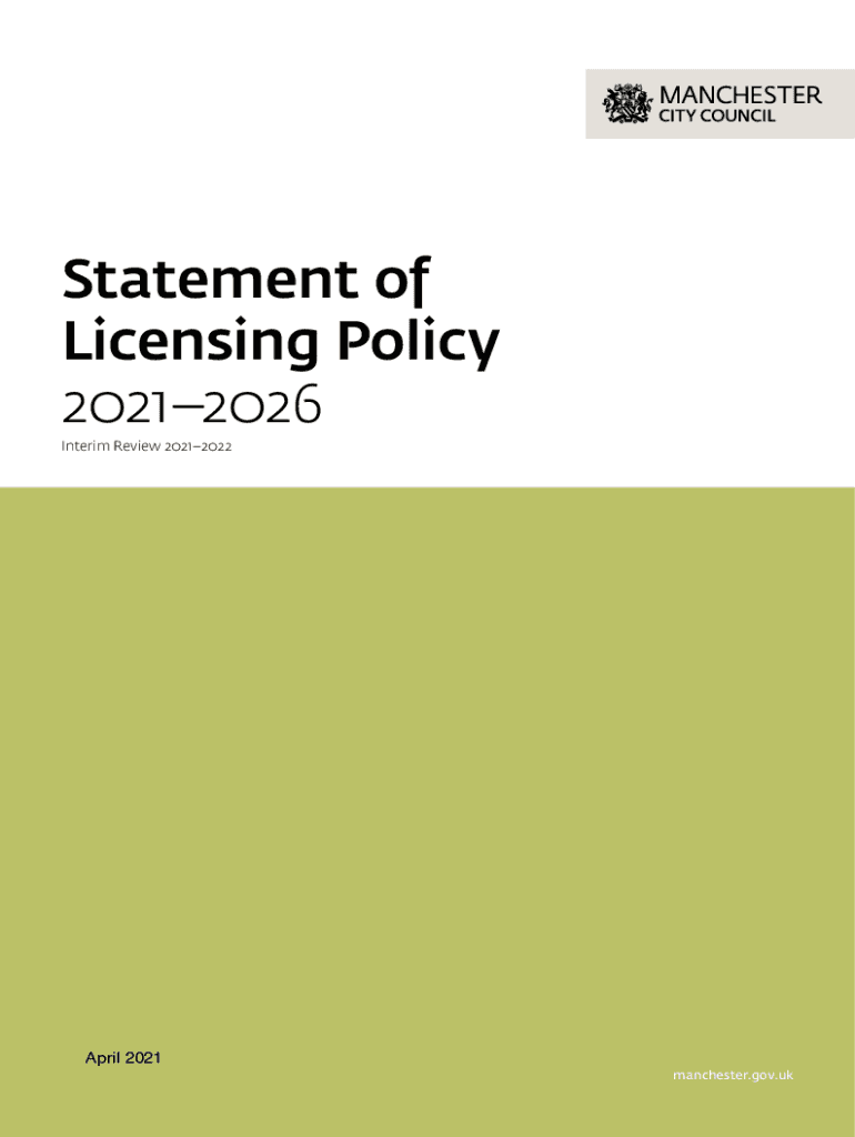 Statement of Licensing Policy 20212026 Interim Review 20212022April 2021 Manchester.gov.contents Foreword by Leader...............................................................................................................