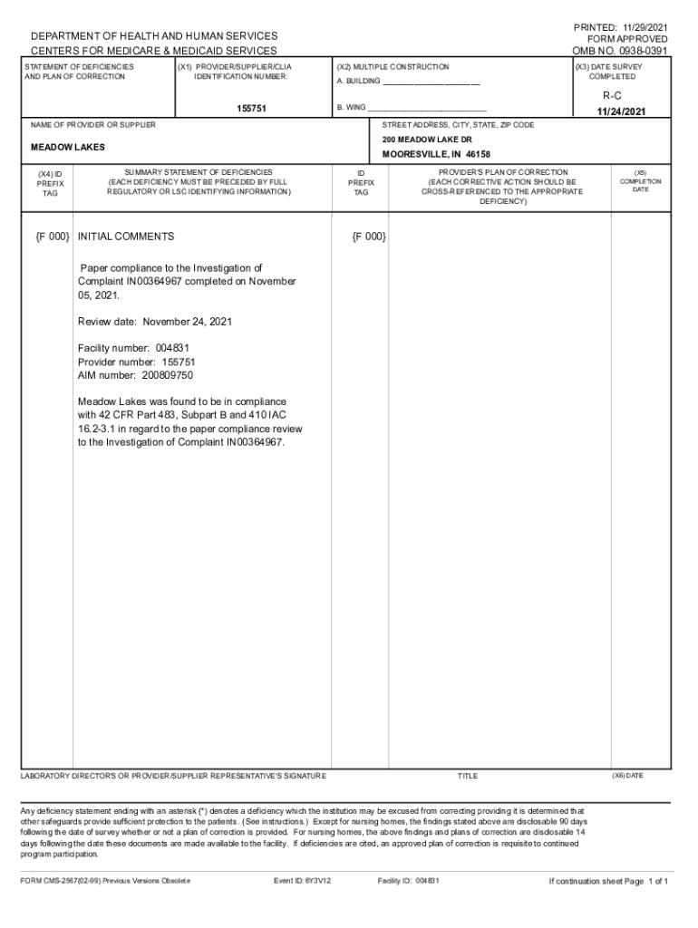 PRINTED: 11/29/2021 FORM APPROVEDDEPARTMENT OF HEALTH AND HUMAN SERVICES CENTERS FOR MEDICARE & MEDICAID SERVICES STATEMENT OF DEFICIENCIES AND PLAN OF CORRECTION(X1) PROVIDER/SUPPLIER/CIA IDENTIFICATION
