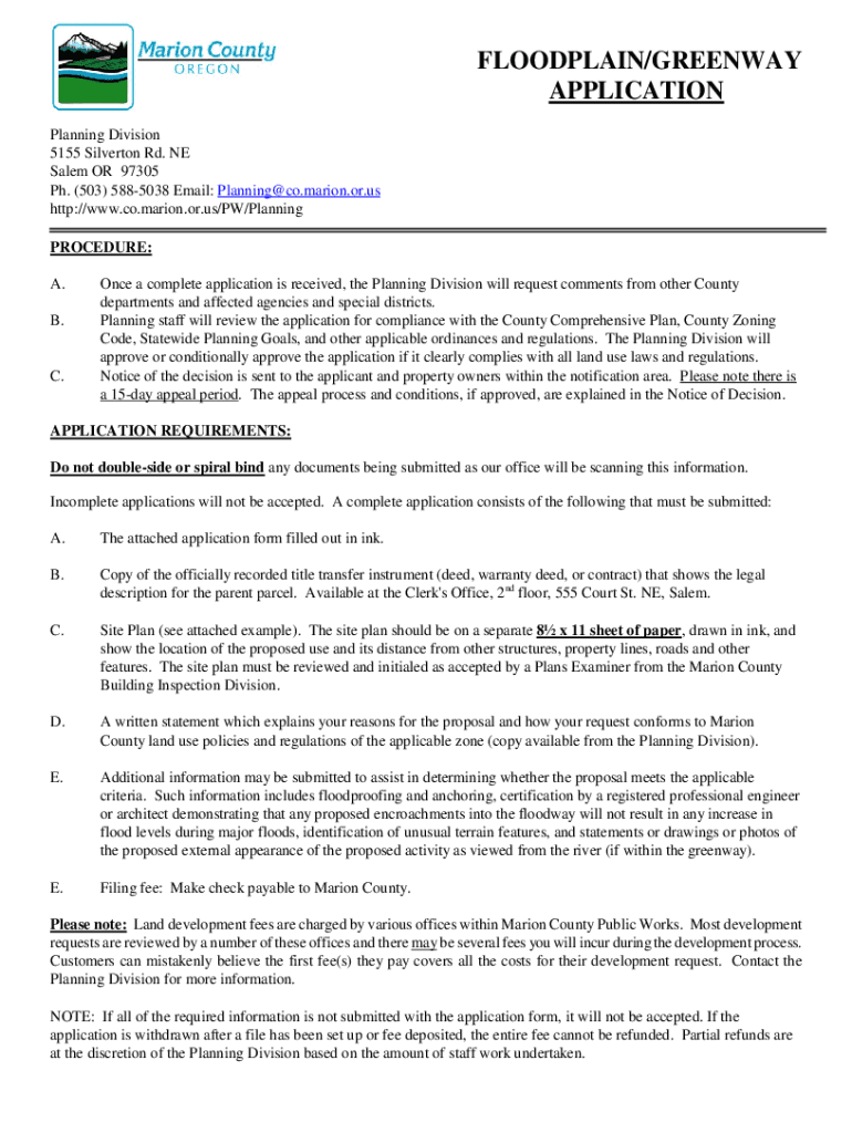 FLOODPLAIN/GREENWAY APPLICATION Planning Division 5155 Silverton Rd. NE Salem OR 97305 pH. (503) 5885038 Email: Planning@co.marion.or.us http://www.co.marion.or.us/PW/Planning PROCEDURE: A. B.C. Once