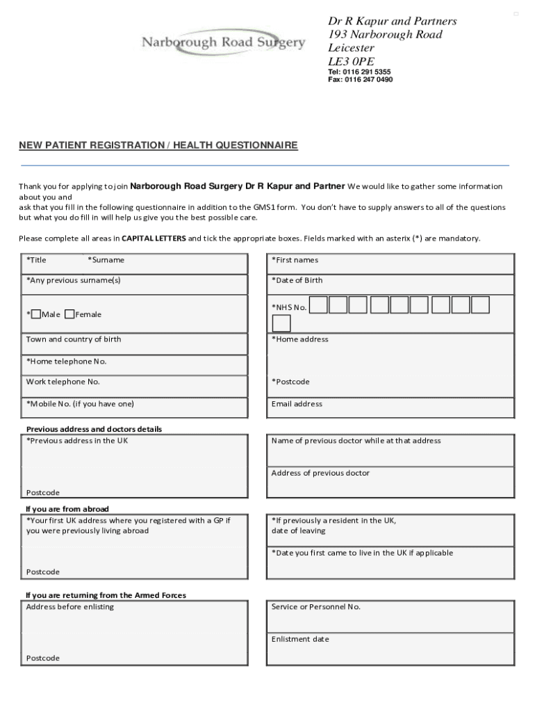Dr R Kanpur and Partners 193 Scarborough Road Leicester LE3 0PE Tel: 0116 291 5355 Fax: 0116 247 0490NEW PATIENT REGISTRATION / HEALTH QUESTIONNAIREThank you for applying to join Scarborough Road