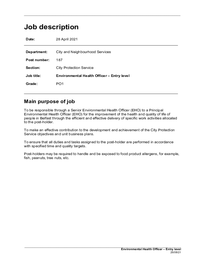 ___Job description Date:28 April 2021___ Department:City and Neighborhood Services Post number:187Section:City Protection Service Job title:Environmental Health Officer Entry Belgrade:PO1___Main purpose
