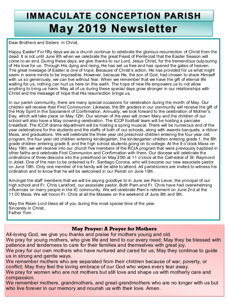 IMMACULATE CONCEPTION PARISH May 2019 Newsletter Dear Brothers and Sisters in Christ, Happy Easter! For fifty days we as a church continue to celebrate the glorious resurrection of Christ from the