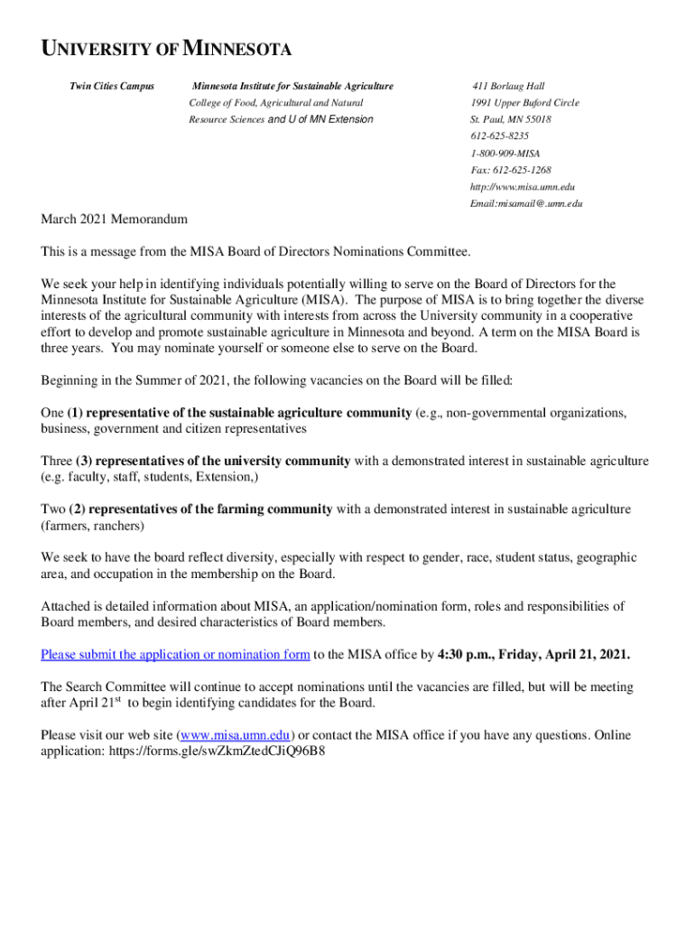 Twin Cities Campus Minnesota Institute for Sustainable Agriculture411 Borlaug Daly College of Food, Agricultural and Natural1991 Upper Buford CircleResource Sciences and U