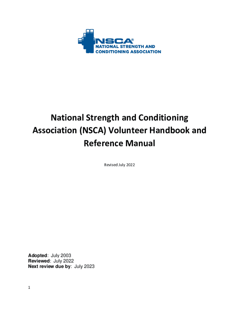 National Strength and Conditioning Association (NSA) Volunteer Handbook and Reference Manual Revised July 2022Adopted: July 2003 Reviewed: July 2022 Next review due by: July 20231Contents Welcome