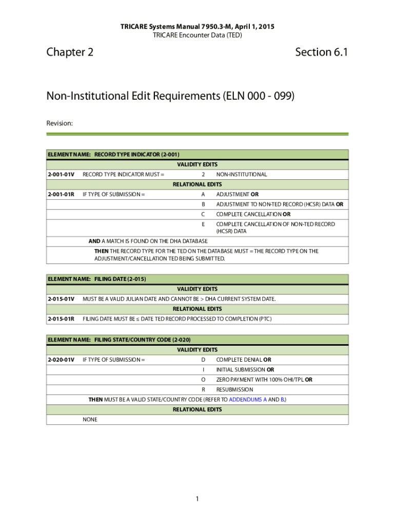 TRI CARE Systems Manual 7950.3M, April 1, 2015, TRI CARE Encounter Data (TED)Chapter 2Section 6.1NonInstitutional Edit Requirements (ELN 000 099) Revision:ELEMENT NAME: RECORD TYPE INDICATOR (2001)