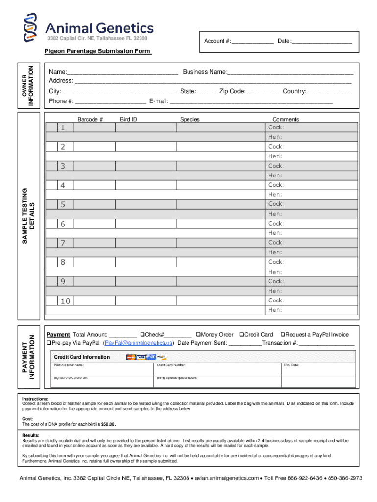 3382 Capital Cir. NE, Tallahassee FL 32308Account #:___ Date:___OWNER INFORMATIONPigeon Parentage Submission Form Name:___ Business Name:___ Address: ___ City: ___ State: ___ Zip Code: ___ Country:___
