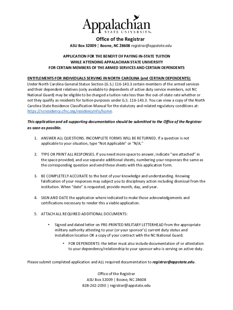 Office of the Registrar ASU Box 32009 Boone, NC 28608 registrar@appstate.edu APPLICATION FOR THE BENEFIT OF PAYING INSTATE TUITION WHILE ATTENDING APPALACHIAN STATE UNIVERSITY FOR CERTAIN MEMBERS