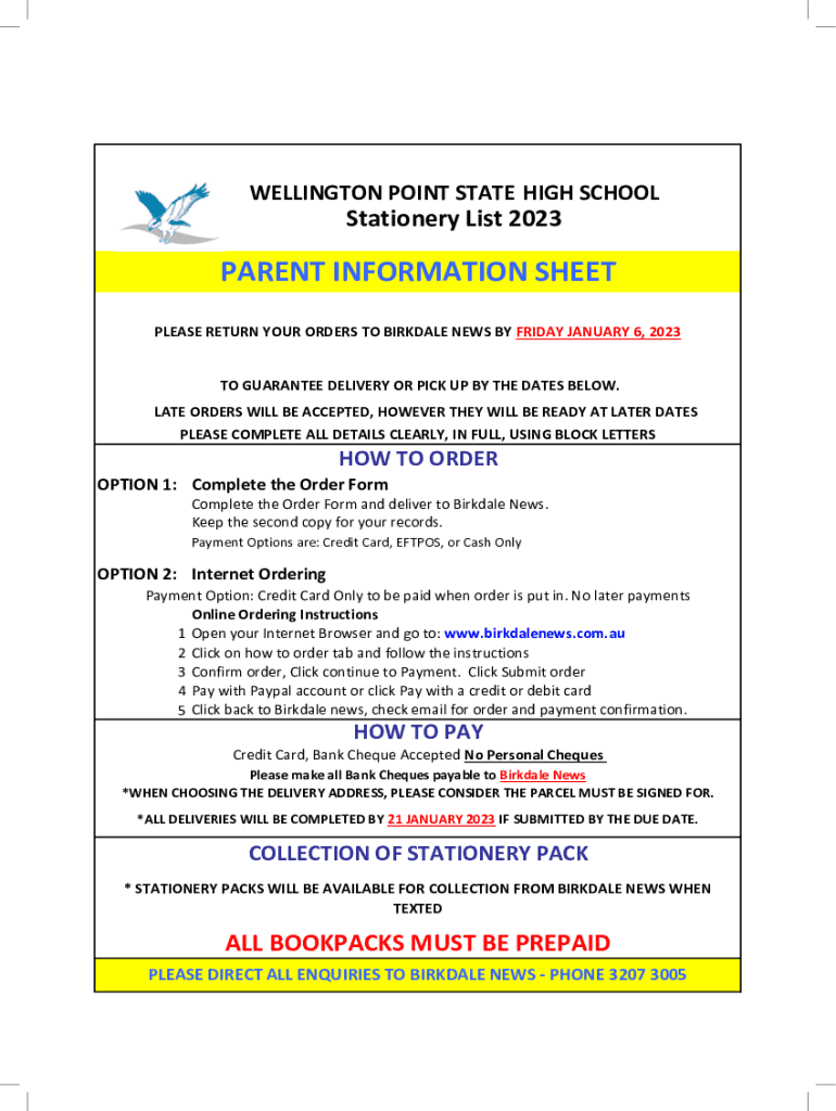 WELLINGTON POINT STATE HIGH SCHOOL WELLINGTON POINT STATE Year 8 Stationery Listing 2019SCHOOLYear 8 Stationery List 2018 Stationery List 2023PARENT INFORMATION SHEET PLEASE RETURN YOUR ORDERS TO