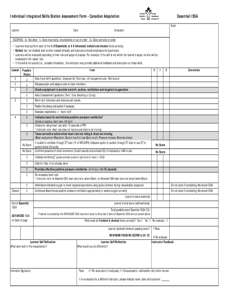 Individual Integrated Skills Station Assessment Form Canadian Adaptation Learner:Date:Essential SSA Brief:Evaluator:SCORING: 0 Not done 1 Done incorrectly, incompletely or out of order 2 Done correctly