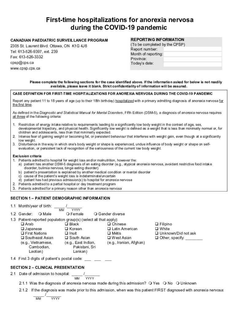 First time hospitalizations for anorexia nervosa during the COVID-19 pandemic CANADIAN Pediatric SURVEILLANCE PROGRAM 2305 St. Laurent Blvd. Ottawa, ON K1G 4J8 Tel: 6135269397, ext. 239 Fax: 6135263332