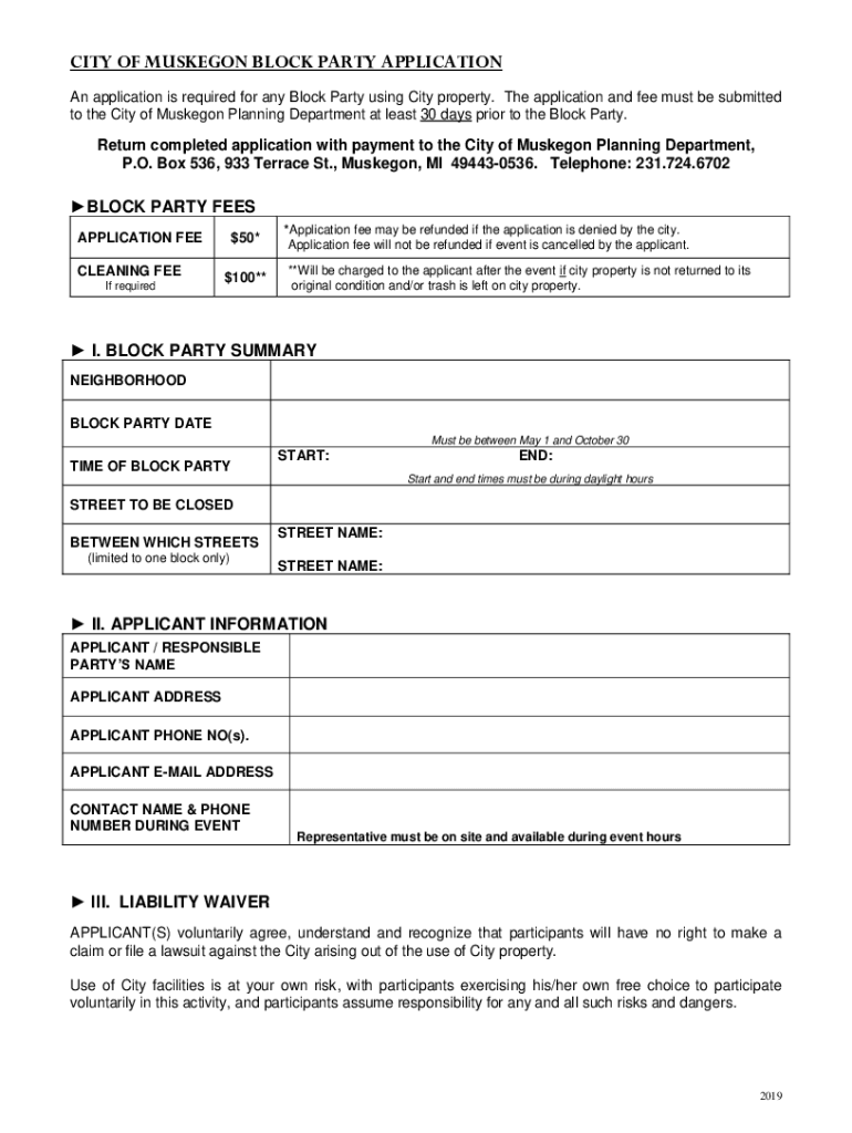 CITY OF MUSKEGON BLOCK PARTY APPLICATION An application is required for any Block Party using City property. The application and fee must be submitted to the City of Muskegon Planning Department at