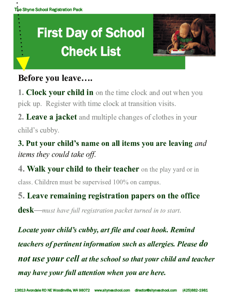 The Shane School Registration Pacifist Day of School Check List Before you leave. 1. Clock your child in on the time clock and out when you pick up. Register with time clock at transition visits.2.