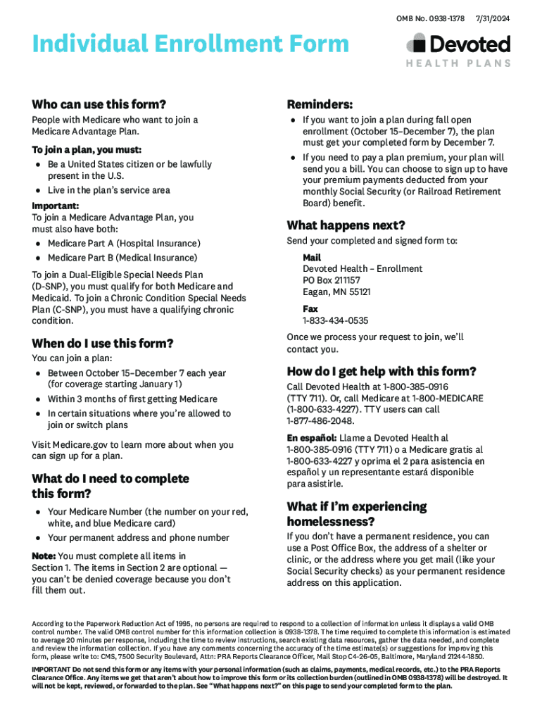 OMB No. 093813787/31/2024Individual Enrollment Form Who can use this form? People with Medicare who want to join a Medicare Advantage Plan. To join a plan, you must: Be a United States citizen or