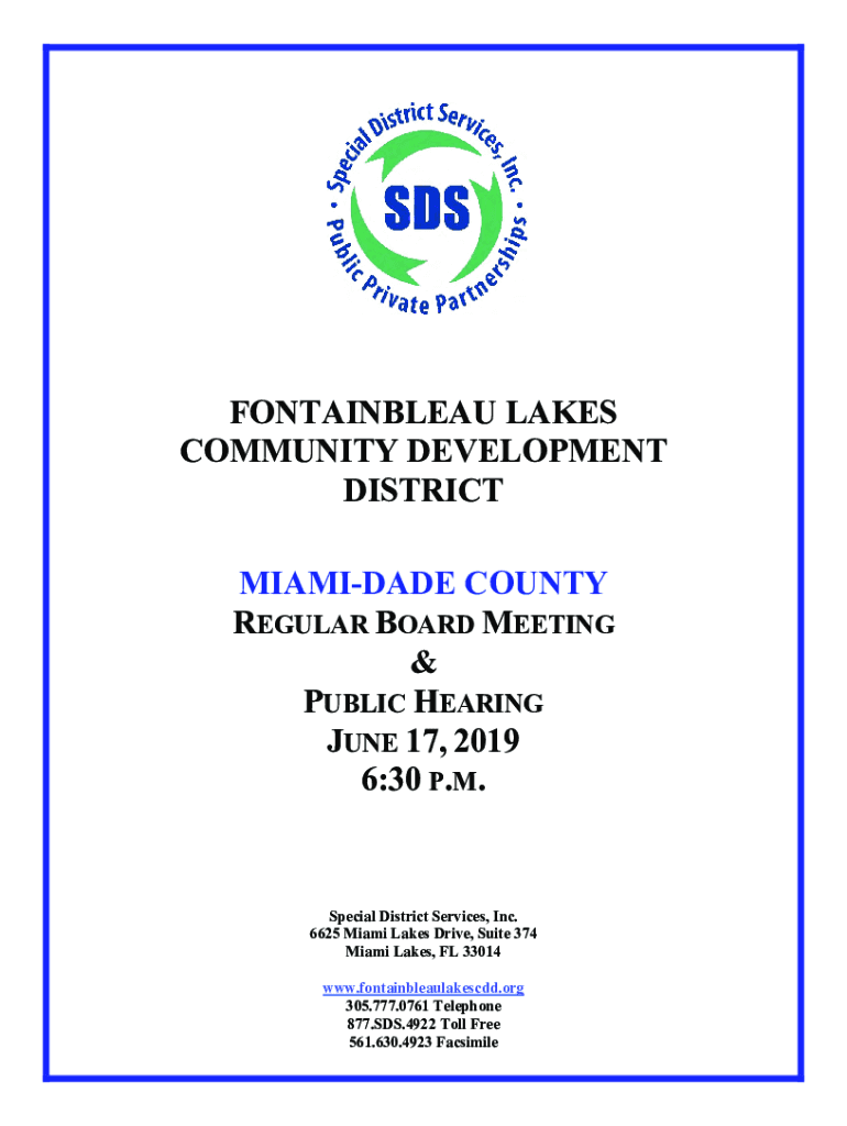 FONTAINEBLEAU LAKES COMMUNITY DEVELOPMENT DISTRICT MIA MIDADE COUNTY REGULAR BOARD MEETING & PUBLIC HEARING JUNE 17, 2019 6:30 P.M. Special District Services, Inc. 6625 Miami Lakes Drive, Suite 374