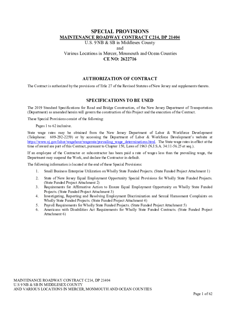 SPECIAL PROVISIONS MAINTENANCE ROADWAY CONTRACT C214, DP 21404 U.S. 9 NB & SB in Middlesex County and Various Locations in Mercer, Monmouth and Ocean Counties CE NO: 2622716AUTHORIZATION OF CONTRACT