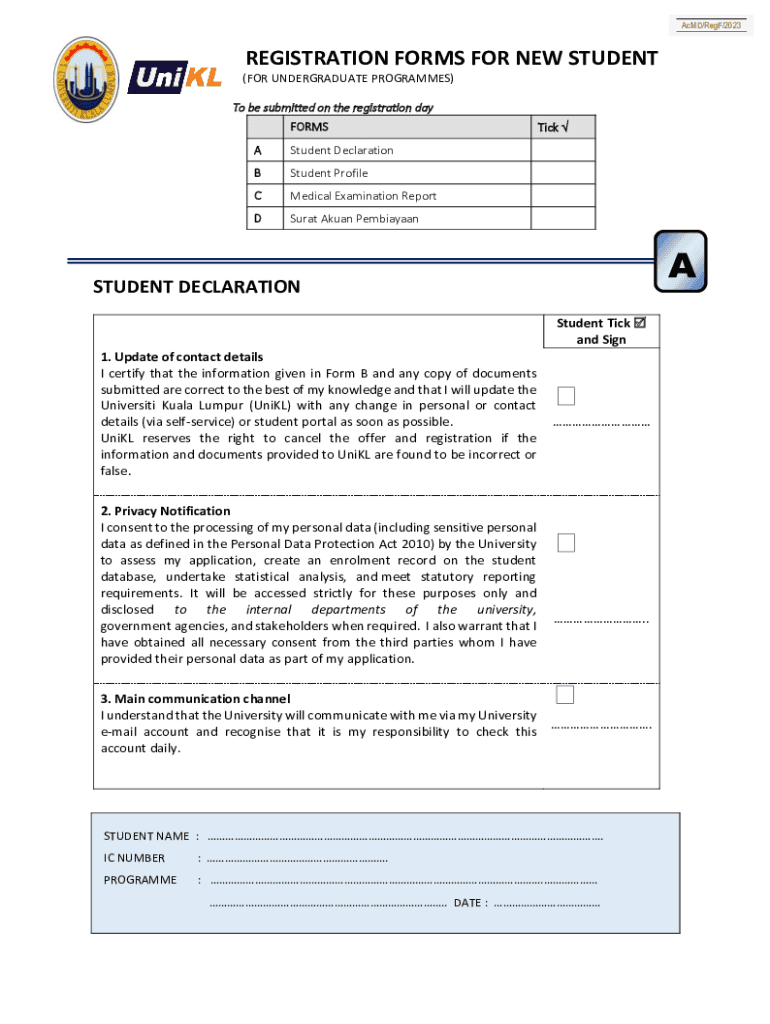 Acid/Reef/2023REGISTRATION FORMS FOR NEW STUDENT (FOR UNDERGRADUATE Programs) To be submitted on the registration day FORMS Student DeclarationBStudent ProfileCMedical Examination ReportDSurat Asian