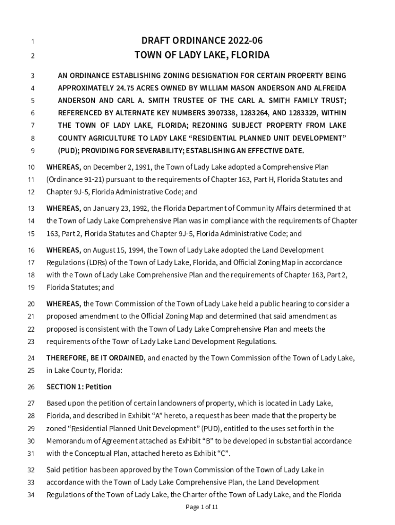 2DRAFT ORDINANCE 202206 TOWN OF LADY LAKE, FLORIDA3AN ORDINANCE ESTABLISHING ZONING DESIGNATION FOR CERTAIN PROPERTY BEING4APPROXIMATELY 24.75 ACRES OWNED BY WILLIAM MASON ANDERSON AND ALFREIDA5ANDERSON