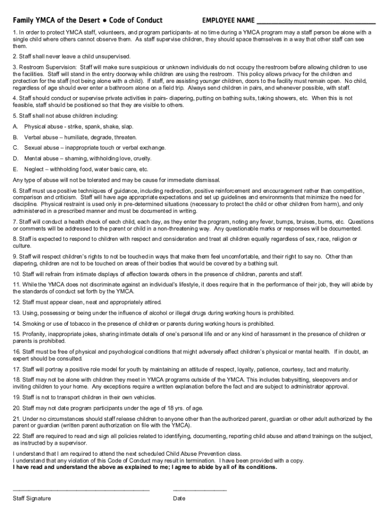 1. In order to protect YMCA staff, volunteers, and program participants at no time during a YMCA program may a staff person be alone with a single child where others cannot observe them. As staff