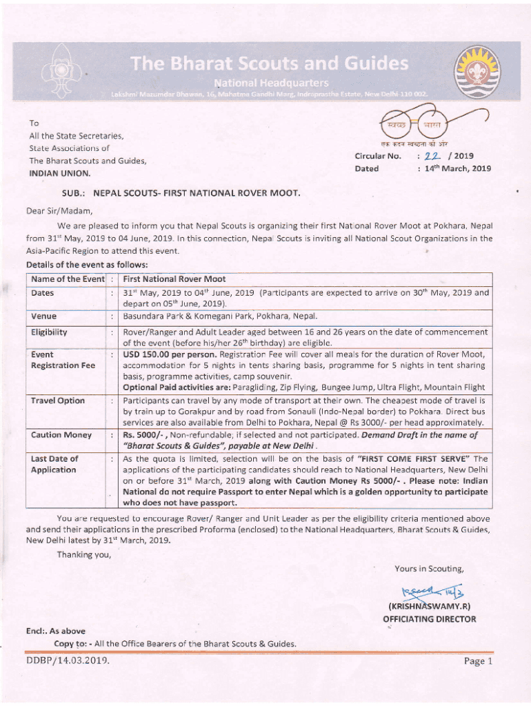 Tall the State Secretaries, state Associations the Bharat Scouts and Guides, INDIAN UNION.SUB.:CircufarDated.r7.qtzzJ4+No. 22:14th/oligarch,2019NEPAL SCOUTS FIRST NATIONAL ROVER MOOT. Dear Sir/Madam,
